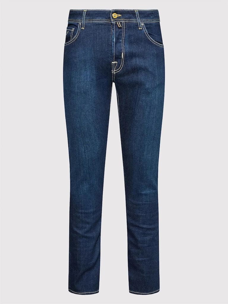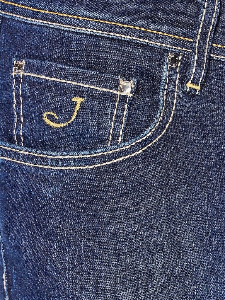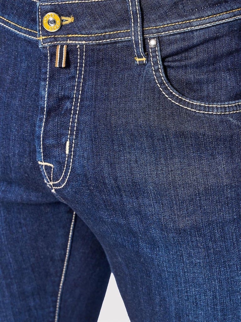 - Dark-blue hand-sanded, stonewashed super-stretch denim
